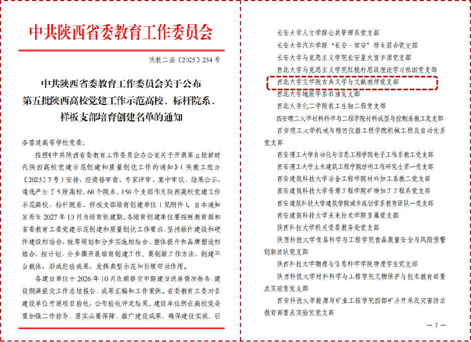 策划制作“品清廉诗词·树清风正气”特别节目在全省高校廉政建设平台展播。“典亮古诗文里的廉政、伟人诗词解读党史、汉字根脉里的思育逻辑”等支部特色品牌影响广泛。聚焦7个团队育人风采,推出“榜样的力量”第二季、文苑锦熙师德大讲堂第二期,弘扬“以文报国、以文化人”文脉传统。中国古典文学与文献教师党支部入选省级党样板支部培育名单;国际中文教育专硕党支部获评学校首届研究生党建双创样板党支部。原创剧目《天下第一鱼畅想曲》入选2025年科学家故事舞台剧推广行动培育剧目。学生“弘文研语·同心同梦”实践团获评省级社会实践标兵团队,1名学生获第二届全国大学生职业规划大赛陕西省赛金奖,学生三部作品入选陕西省重大文化精品扶持项目“种下一部电影”。