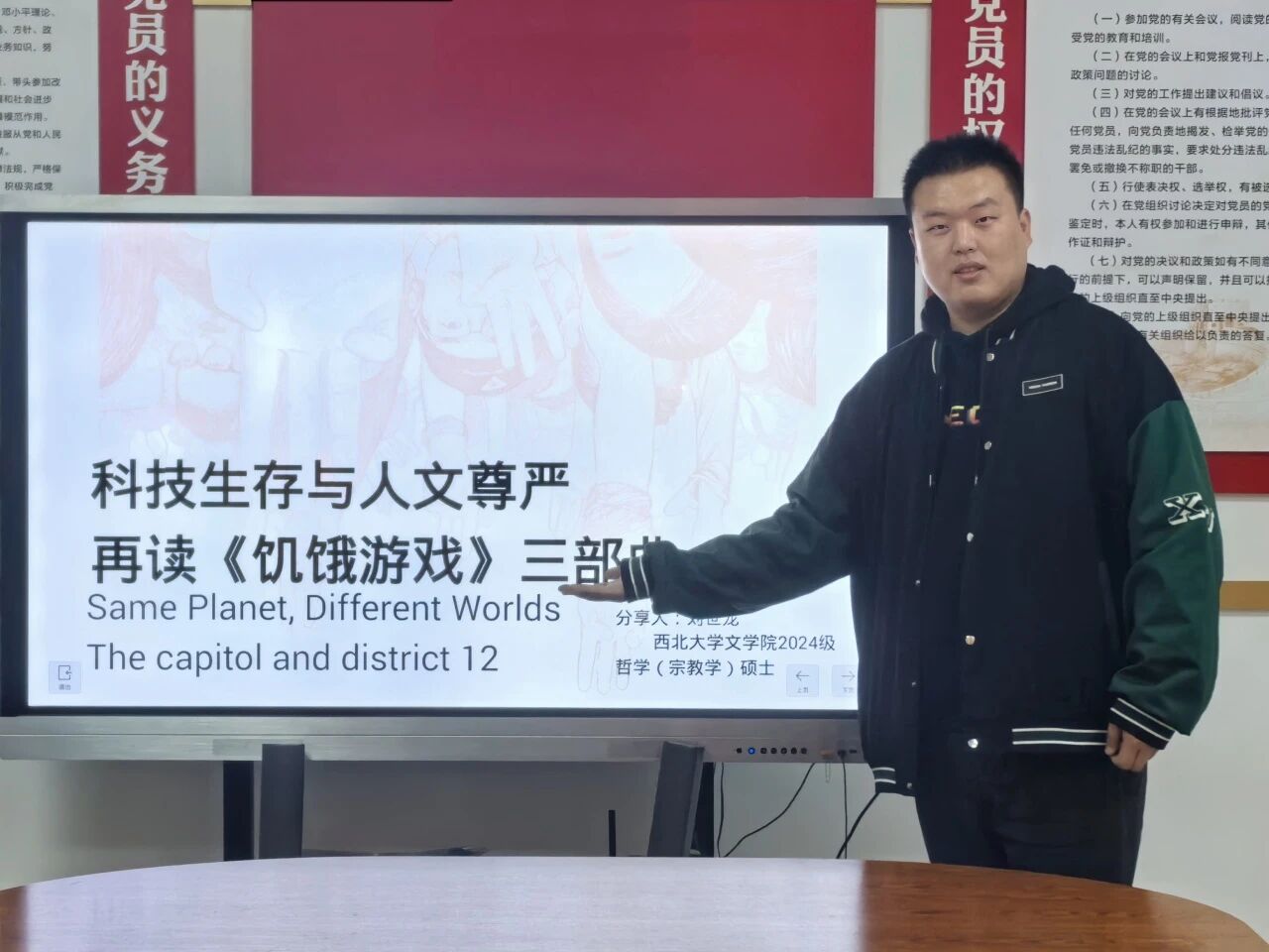 来自betway西汉姆联官网的刘世龙同学分享了《饥饿游戏》三部曲,以帕纳姆国的血色游戏场为核心,快速勾勒出科技异化的残酷现实。都城用摩天楼、磁悬浮列车、基因编辑构建乌托邦,而十二辖区却变成资源掠夺的殖民地。造价数十亿的竞技场内,技术人员操控着火焰的精准蔓延,培育融合死者特征的变种兽……这些本可改善生存的科技,最终沦为将杀戮变成沉浸式娱乐的工具,维系着都城的残暴统治。而作品主人公凯特尼斯从被迫参加游戏的幸存者到逐渐成长为反抗都城暴政的“嘲笑鸟”,这一反抗本身也可能带来新的权力斗争和创伤,制造新的压迫和反抗。主讲人还深刻解读了隐藏在《饥饿游戏》文字之下的主题,并联系当今世界的变化,叩问科技与人文的和谐共进之路。