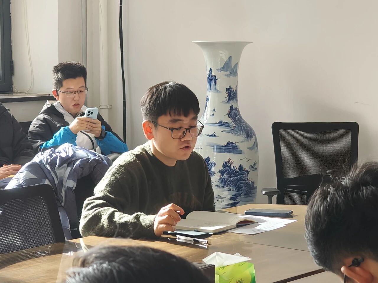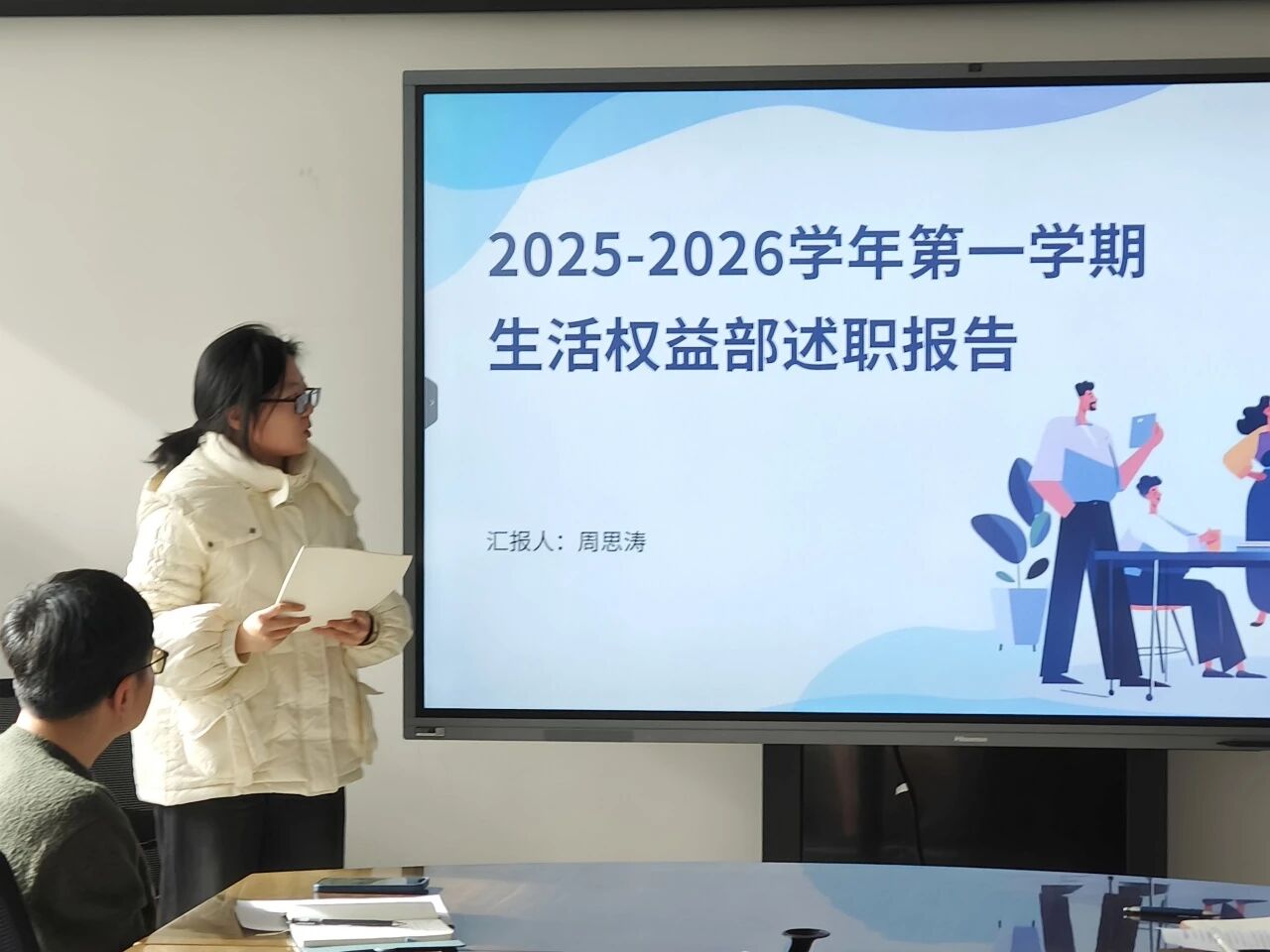 秘书部工作人员贺路然从“运转枢纽”和“制度基石”双重视角出发,汇报了部门在会务组织、资料准备、制度修订及重大活动保障中的细致工作;学风建设部工作人员陈子悦紧扣“文以载道,学以修身”的工作思路,汇报了“学长学姐说”系列活动、新生辩论赛等学风建设活动如何点燃思辨火花,并展望了下学期即将举办的系列促学风建设的活动,致力于营造更加浓厚的文化氛围;生活权益部工作人员周思涛汇报了宿舍风采大赛中的温馨故事,以及通过“权益邮箱”渠道推动解决多项实际诉求的务实历程,并展望精心策划的“晚安计划”等情感纽带项目,提升服务温度与精准度。