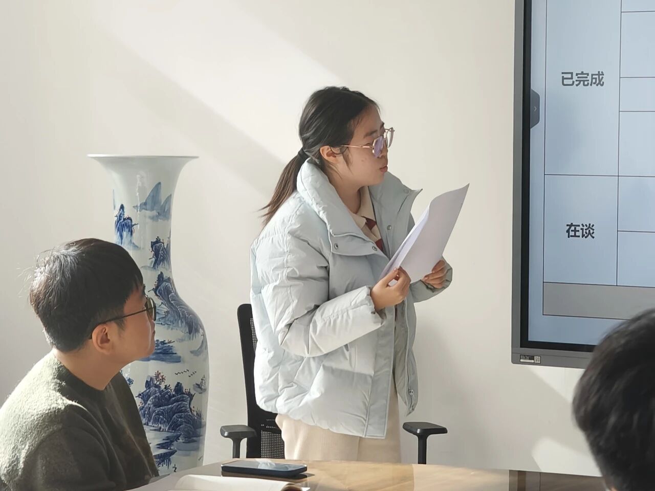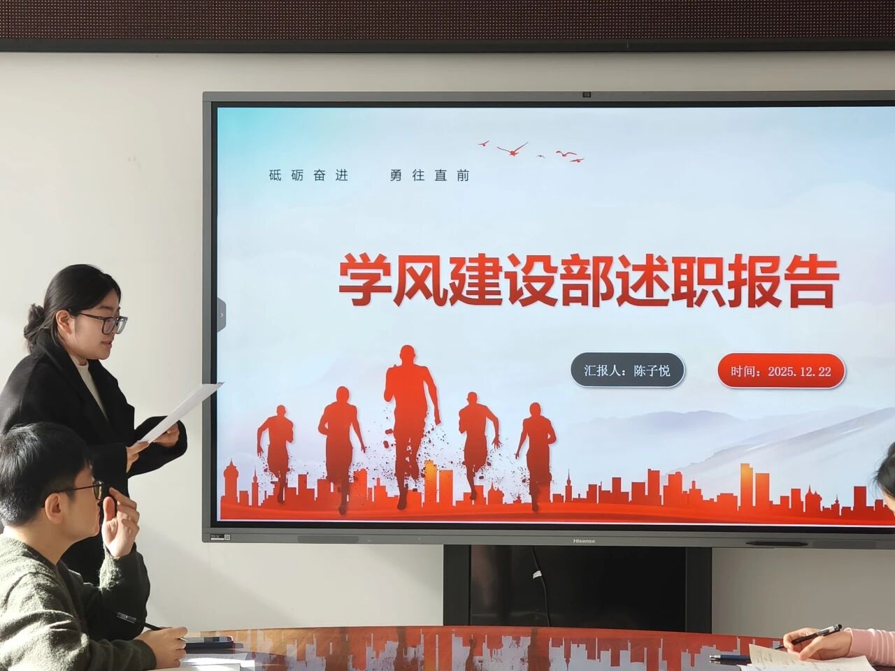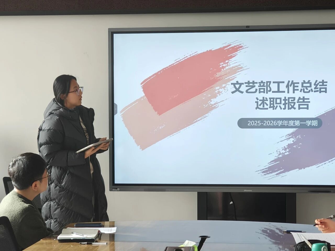 体育部工作人员王晶以“强健体魄,多彩生活”为引,汇报了本学期成功举办的“律动青春”校园健身操等校园体育活动,同时,在保障各运动队训练参赛方面不懈努力,助力学院在多项赛事中夺得荣誉;文艺部工作人员马子怡聚焦“以文化人,以美育人”,回顾了从迎新歌唱赛的舞台到“黑美人”艺术节幕后支持的工作历程,展现了部门在繁荣学院美育生活中的积极作为,同时诚恳反思了在大型活动细节把控与成员梯队培养上的不足,明确了未来精进的方向;外联部工作人员邓皓雯从“内引外联,汇聚资源”的维度,汇报了在拓展校企合作、促进校际交流等方面的探索与成果。