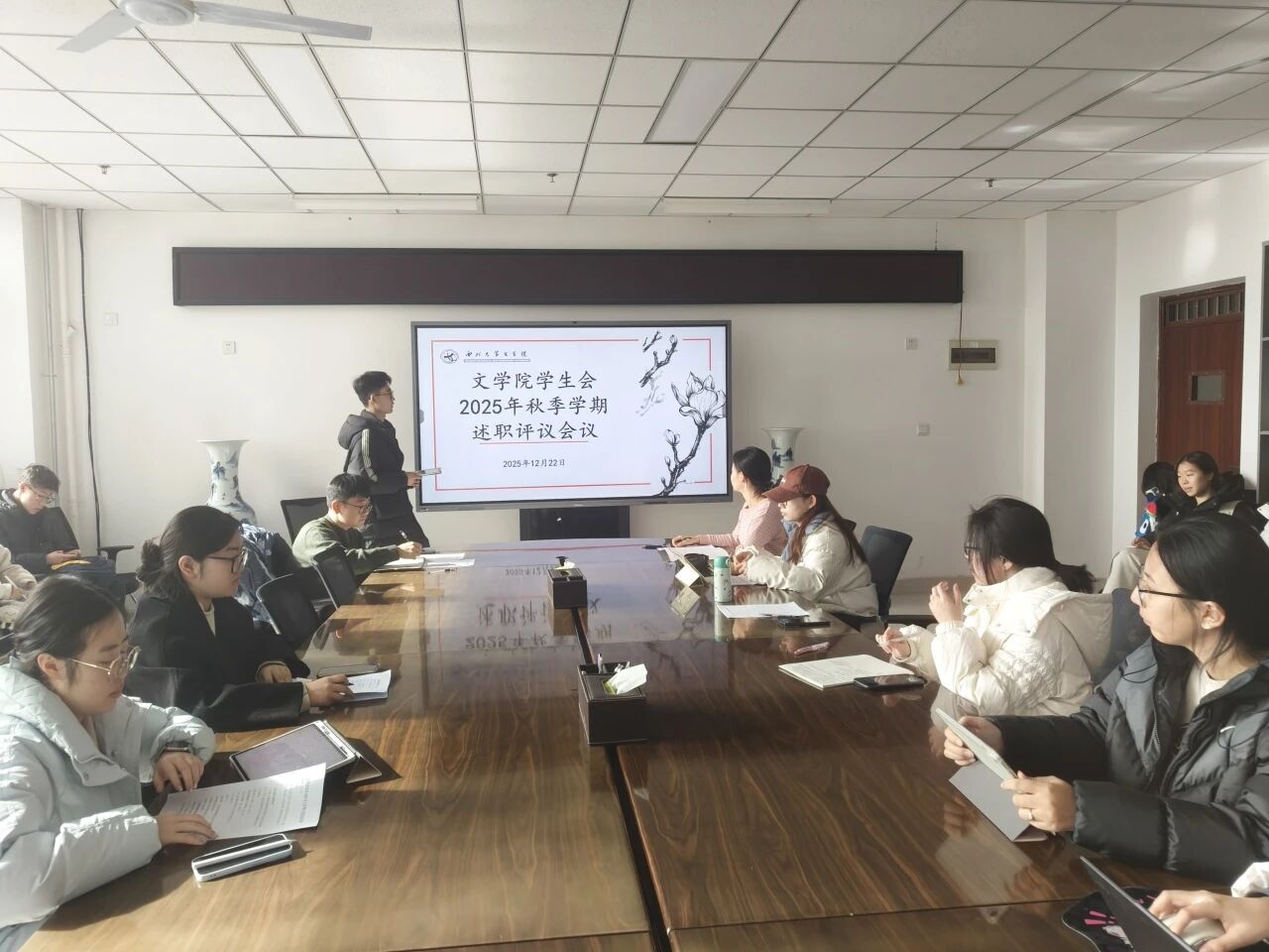 会议伊始,主席团成员进行述职。他们立足全局,以清晰的逻辑梳理了本学期学生会在思想引领、组织建设、活动开展等方面的工作脉络。对分管部门在专题学习、校园文化、生活服务、体育竞技等领域的扎实工作进行了概括性总结,并全面汇报了在专题学习会、运动打卡计划、宿舍风采大赛、新生辩论赛等具体活动中的落实成果,展现了学生会的整体合力与务实作风。