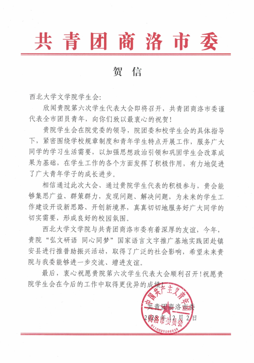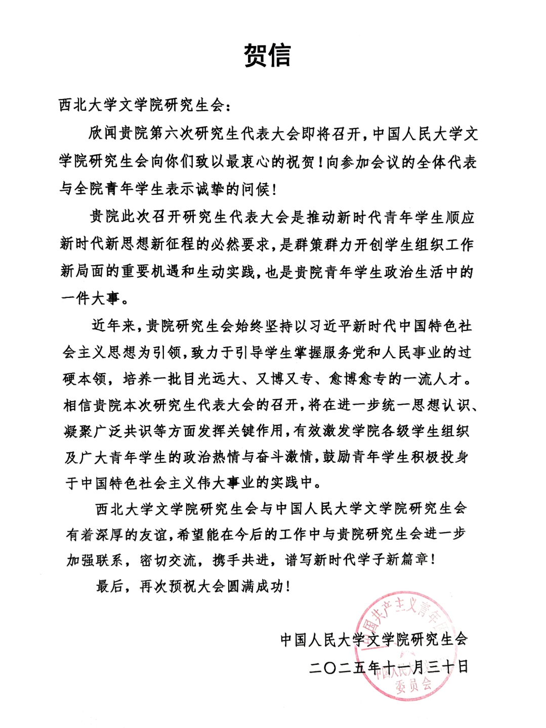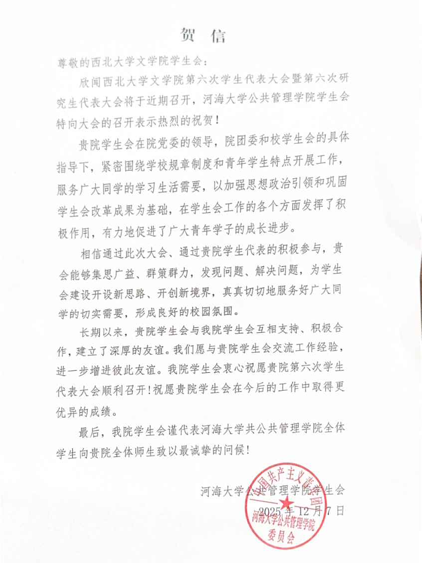 本次大会收到来自中国人民大学、河海大学等兄弟高校学生会、研究生会发来的10余封贺信。